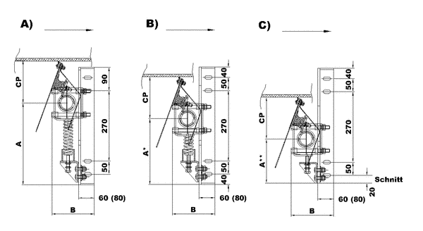 Maß A (Einbauvariante A) bei entspannter Feder ohne Eingengewichtsbelastung/Vorspannung; standardmäßige Ausführung mit Druckfeder (L=130 m); Maß A* (Einbauvariante B); Ausführung mit Druckfeder (L=60 mm); Maß A** (Einbauvariante C) ohne Druckfeder.