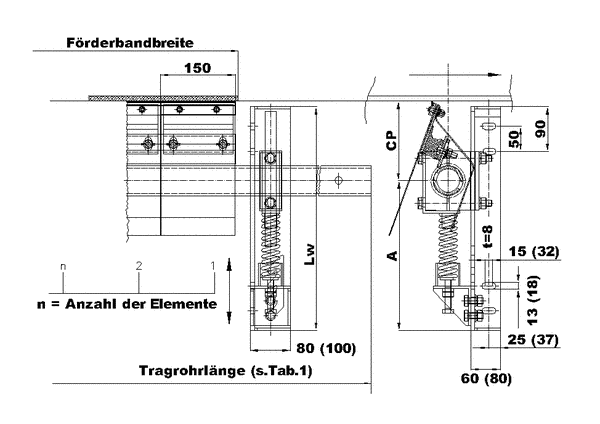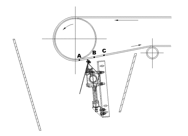 HCP Abstreifer werden im Untergurtbereich, direkt hinter der Abwurftrommel platziert. Die beste Montageposition ist die Position B (ca. 120-150 mm von A entfernt, wo sich das Förderband von der Trommel löst), straffe und vibrationsfreie Gurtführung vorausgesetzt.